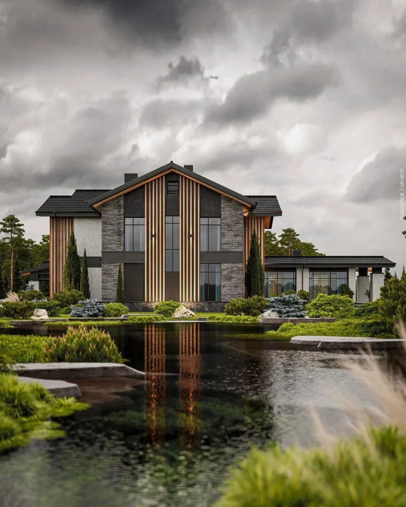 Further along, encounter a facade of vertical cedar slats, backlit at dusk to cast striped shadows on an adjacent courtyard. This slide emphasizes texture in modernism, where wood’s warmth tempers steel’s coolness. @idreamhouse quips, “Slatted serenity #WoodCladding #ModernFacade.” Detailed breakdown: Cedar’s natural oils repel insects, requiring minimal treatment, and the slats can pivot for adjustable shading, optimizing passive solar gain. Fundamentals: Vertical elements draw the eye upward, making compact homes feel taller, a trick from Japanese architecture. Spark ideas: Customize slat widths for acoustic damping, muffling street noise, or embed sensors for automated adjustment based on sun position.