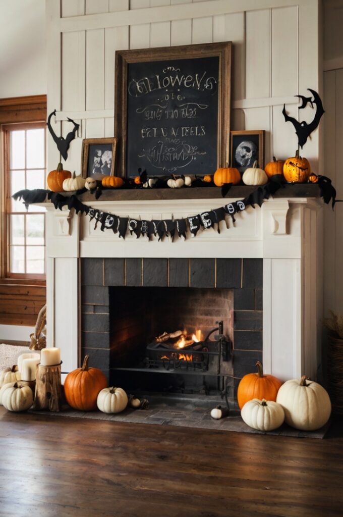 The fireplace mantel is always a statement space. For 2025, drape garlands made of felt ghosts or black bats across the mantel. Pair them with antique frames, weathered wood signs, and neutral pumpkins. Keep the colors soft—gray, black, cream—to balance farmhouse simplicity with Halloween spirit.