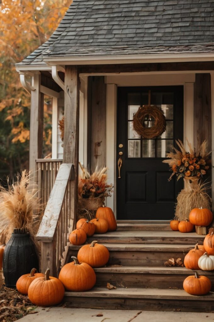 Nothing says farmhouse Halloween like stacked pumpkins by the door. Mix large white pumpkins with smaller orange ones and add dried corn stalks as a backdrop. Lanterns with black candles bring the spooky edge, while woven baskets keep the display rustic. It’s affordable, charming, and impactful.