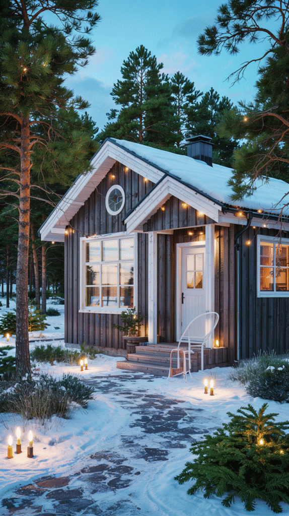 Imagine candy-cane poles, gumdrop lights, and a frosting-like outline along the roof. I had so much fun recreating this look one year — it’s playful, nostalgic, and perfect if you have kids (or a sweet tooth).