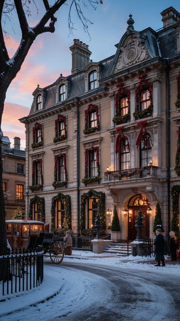 There’s something regal about old-fashioned Christmas charm. I draped velvet garlands, added brass candleholders to the windows, and tied satin ribbons to the door handles — it felt like stepping into Charles Dickens’ A Christmas Carol.
