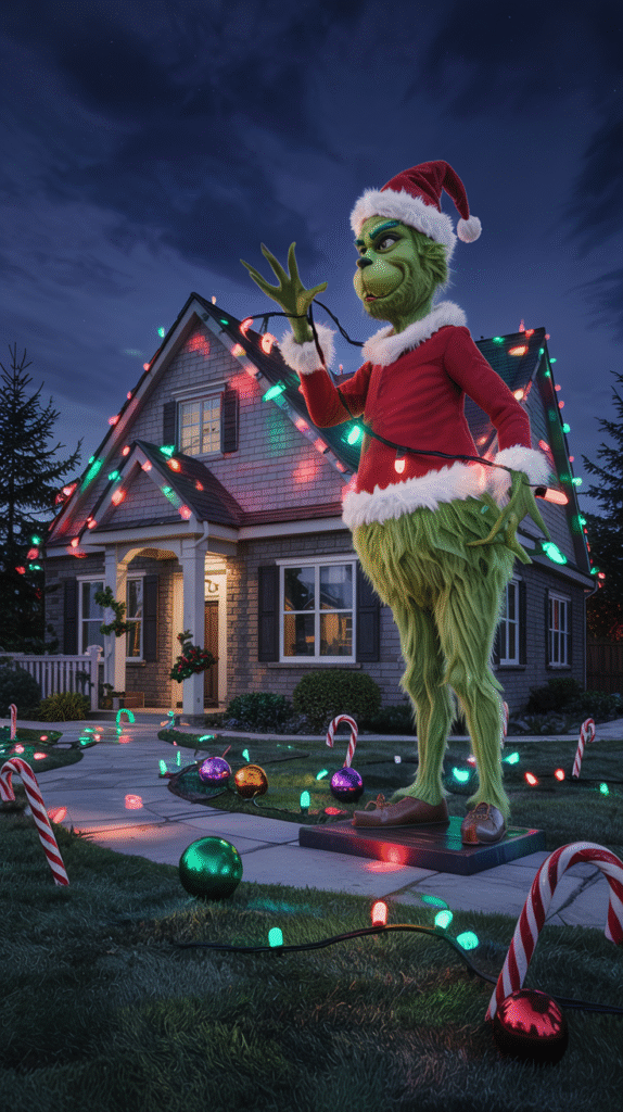 A few years ago, I decided to go fun and quirky with a Grinch display. A big Grinch cutout “stealing” lights from the roof always gets a laugh from passersby. It’s whimsical, playful, and great for families.