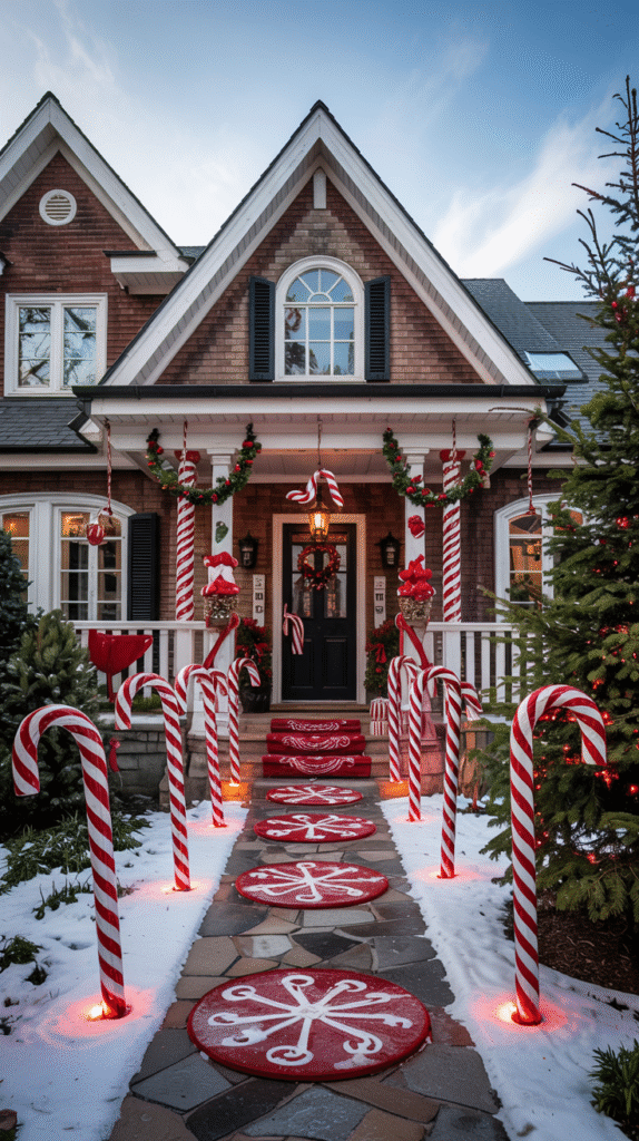 Red-and-white stripes never fail to make a statement. I lined my driveway with oversized candy canes and wrapped porch pillars in striped ribbons. It’s cheerful, bright, and instantly recognizable.