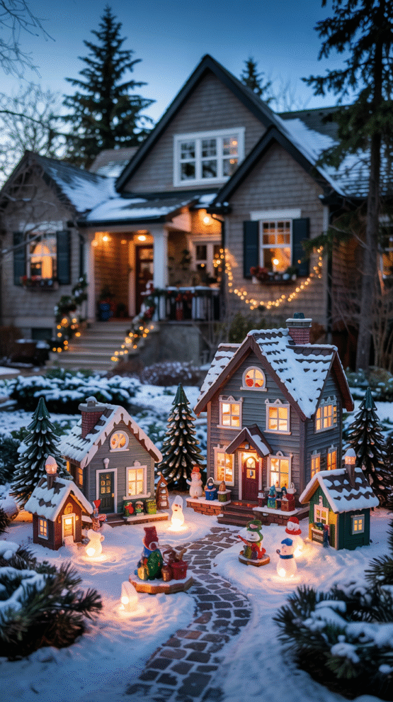 Mini Christmas villages are not just for indoors. I created small glowing “village houses” leading up to my porch — with little figurines and snowmen — turning my front yard into a real-life storybook scene.