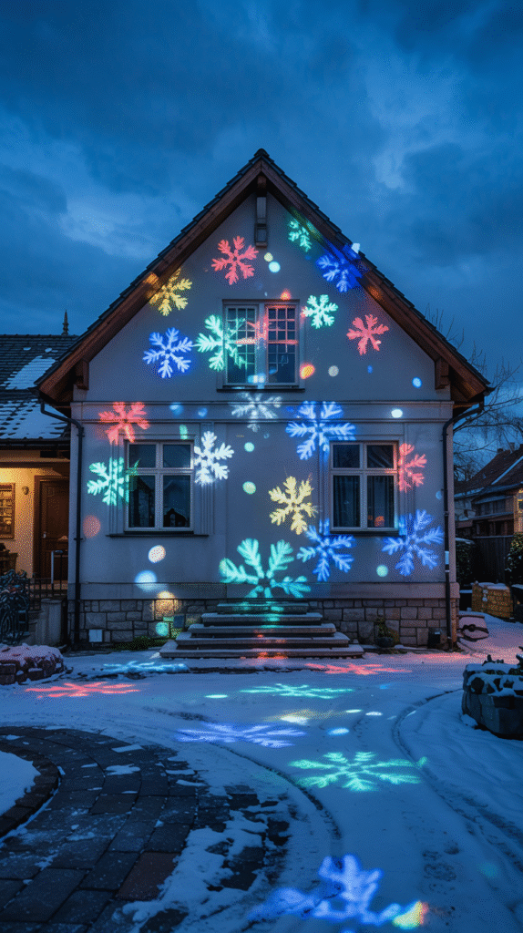 If you want low effort with high impact, try a light projector. I used one that displays snowflakes and another that mimics falling stars across the entire house front — mesmerizing and magical!