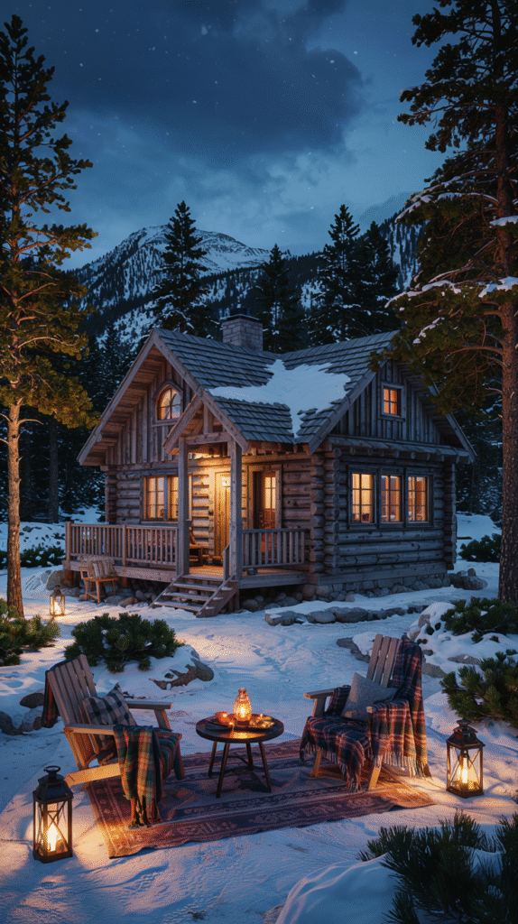 Think wooden logs, plaid blankets, lanterns, and warm yellow light. When I recreated this cabin aesthetic, it felt like a peaceful retreat tucked away in the snowy mountains.