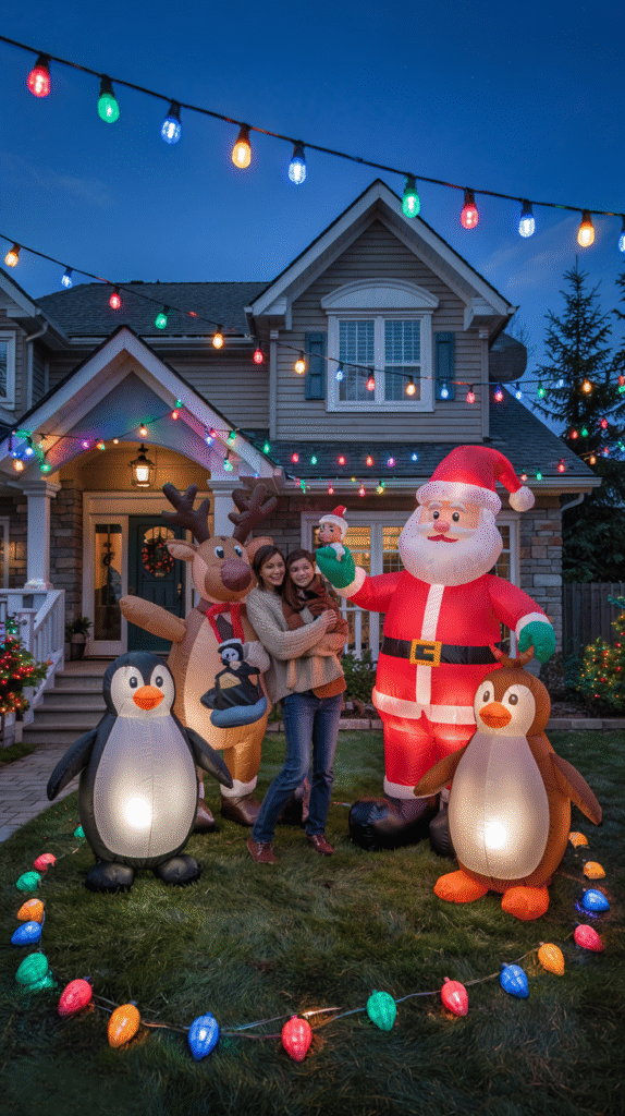Inflatables can be fun if done tastefully. I once placed a few characters — Santa, reindeer, and penguins — on the lawn surrounded by snow lights. It’s cheerful and great for kids.