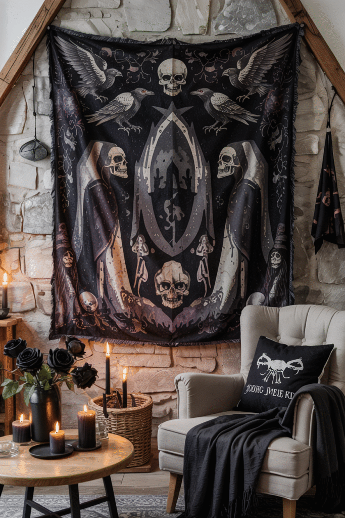 Hang a dark, tattered tapestry with Halloween motifs like ravens, skulls, or witches. Choose fabrics in black, deep purple, or gray with a slightly worn look to fit the cottage aesthetic. Pair with wooden furniture for contrast.