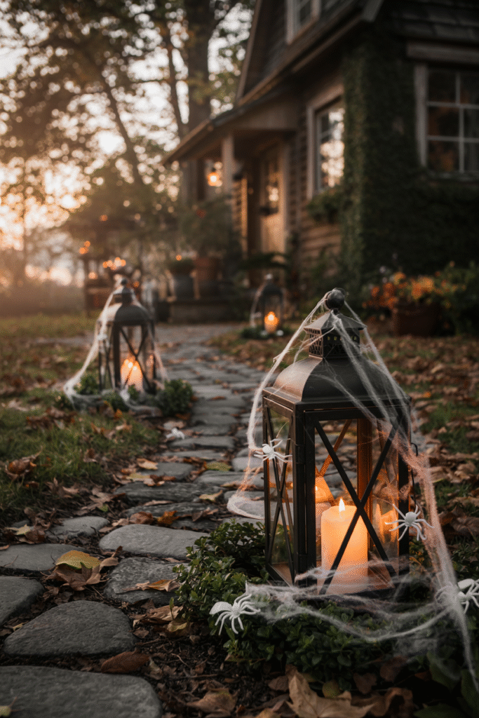 How to Make It: Purchase affordable black lanterns from thrift stores or online retailers. Use battery-operated candles for a worry-free glow. Stretch faux cobwebs thinly across the lanterns and glue small plastic spiders for a creepy touch. Scatter dried leaves or moss (available at craft stores) around the base.