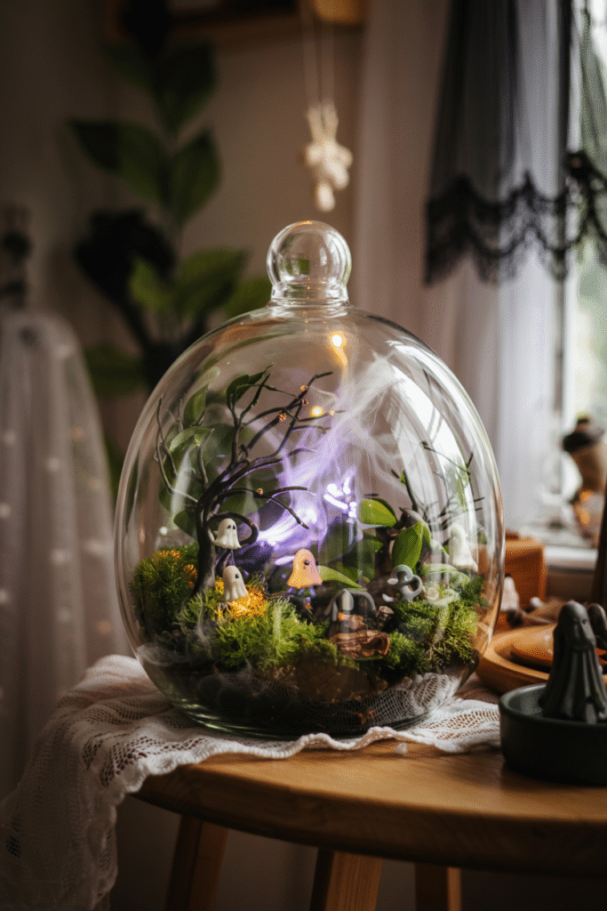 Build a miniature foggy forest in a glass terrarium, using moss, small branches, and tiny Halloween figures like ghosts or skeletons. Add a small LED light to create a misty glow, mimicking a haunted woodland.