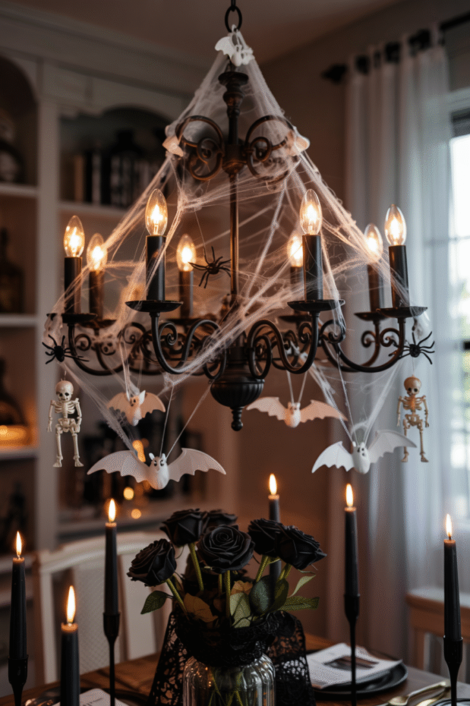 Transform your dining room chandelier into a spooky focal point by draping it with faux cobwebs and hanging small plastic spiders. Add black taper candles or LED candles for a gothic touch. For extra drama, hang lightweight faux bats or tiny skeletons from the chandelier arms.