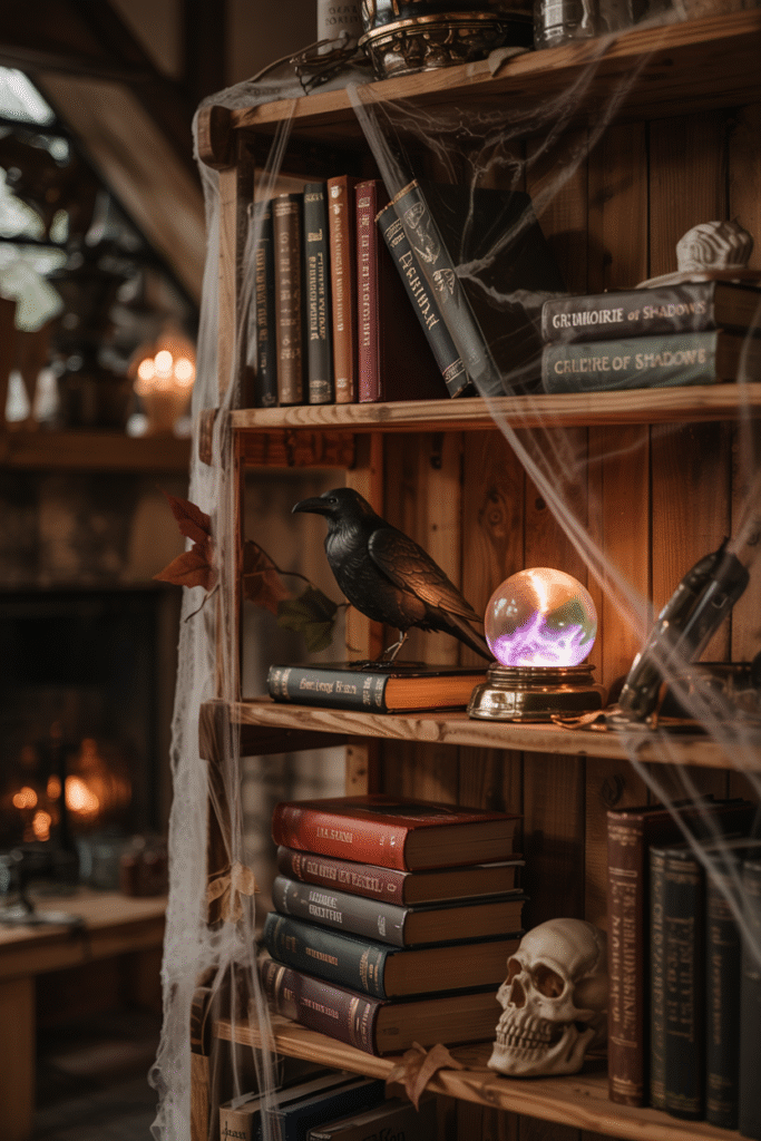 Turn your bookshelf into a dark Halloween centerpiece by stacking old, weathered books with spooky titles. Add small props like a faux raven, a crystal ball, or a skull-shaped bookend. Drape thin black fabric or cheesecloth over the edges for a ghostly effect.