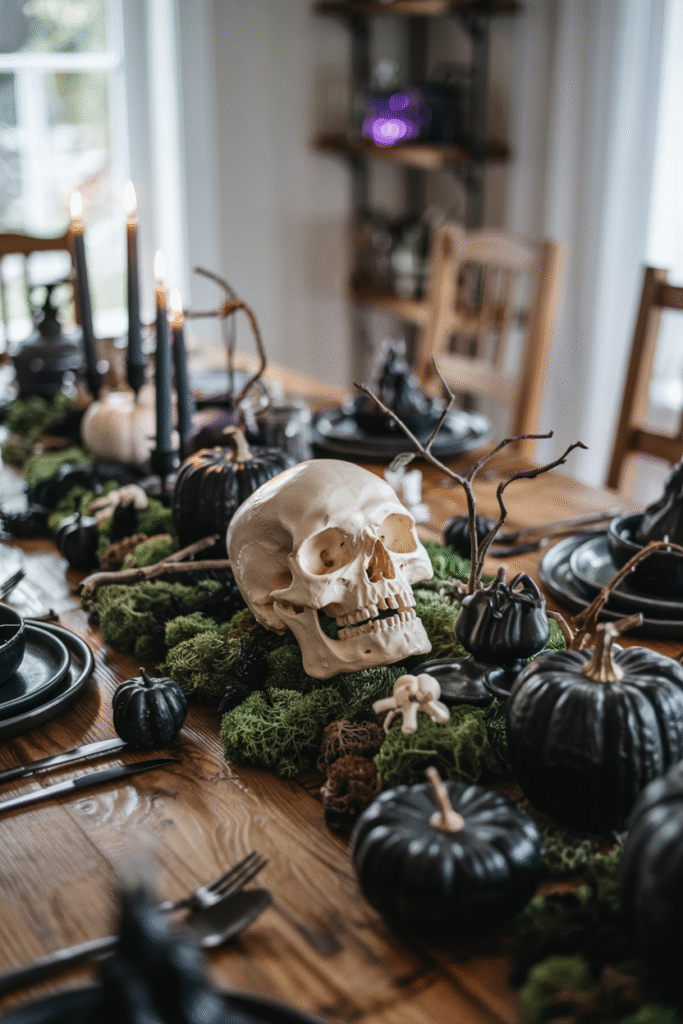 Create a striking dining table centerpiece using a faux skull (or several) placed on a bed of preserved moss. Surround with black candles, dried twigs, and small pumpkins painted in matte black or deep charcoal. This blends the natural cottage aesthetic with a dark Halloween vibe.
