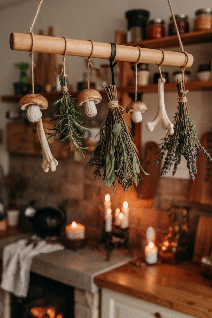 Hang a rustic wooden drying rack in your kitchen or living room, adorned with bundles of dried herbs like rosemary, thyme, or lavender. Add faux elements like dried mushrooms or small bones for a witchy feel. Tie the bundles with black twine for a cohesive look.