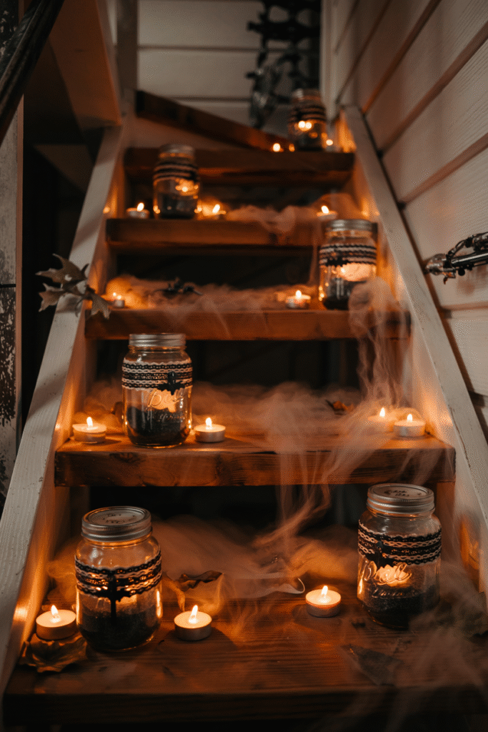 Fill mason jars with black sand or small pebbles, then place LED tea lights inside for a glowing effect. Wrap the jars with black lace or twine and add small charms like bats or keys. Place them on tables or along stairs for a cozy yet spooky glow.