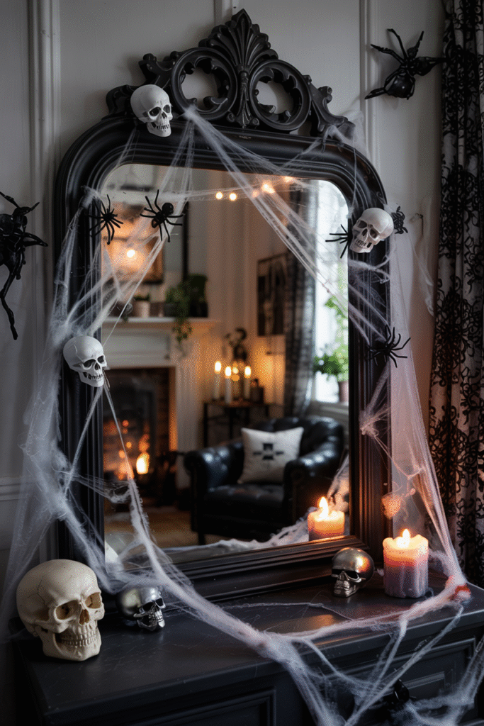 How to Make It: Find an old mirror at a thrift store. Paint the frame with black spray paint. Glue small Halloween props like spiders or skulls around the edges. Drape thin cobwebs for a dusty, abandoned look.