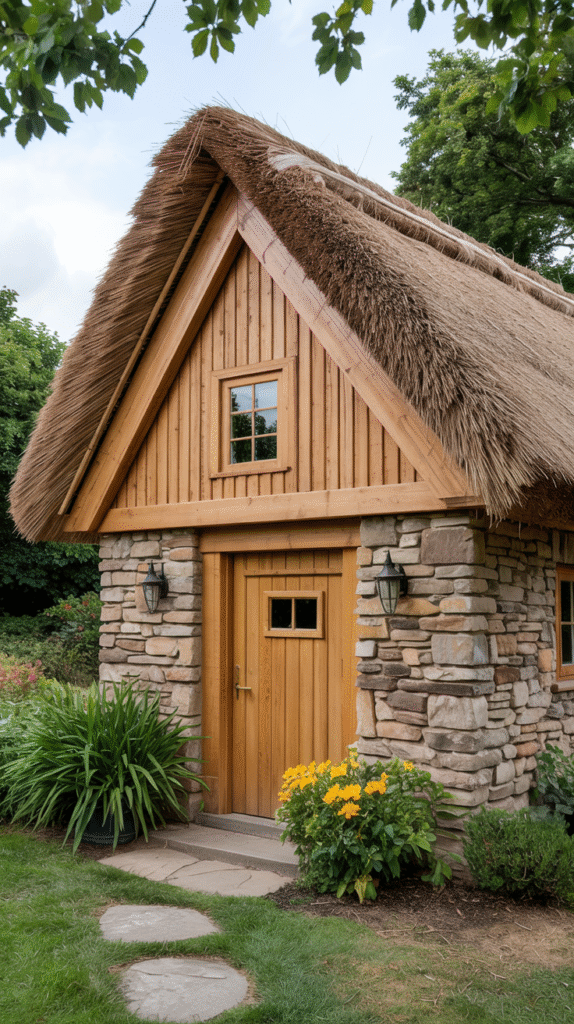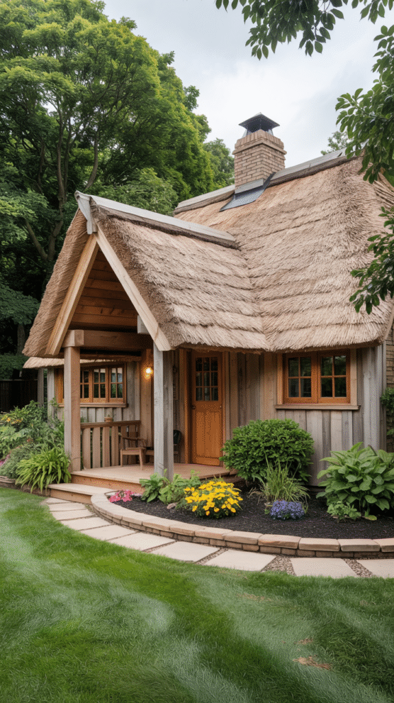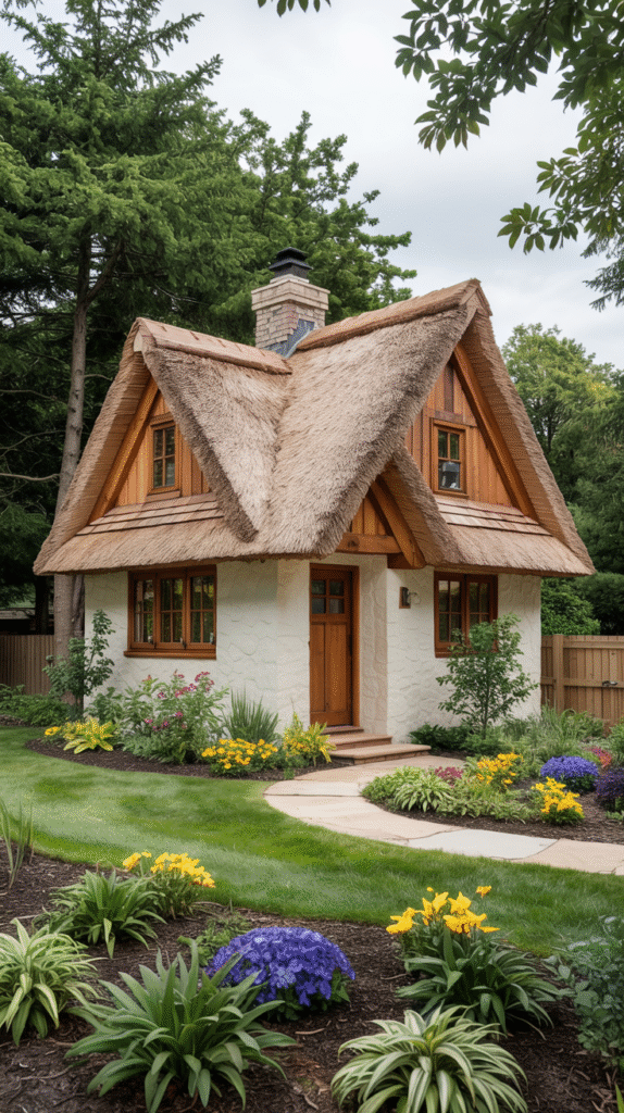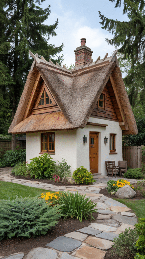 Catslide roofs feature a long, sloping extension on one side, often covering a lean-to or porch. This asymmetrical design adds a playful, storybook charm, with thatch cascading like a waterfall over the cottage.