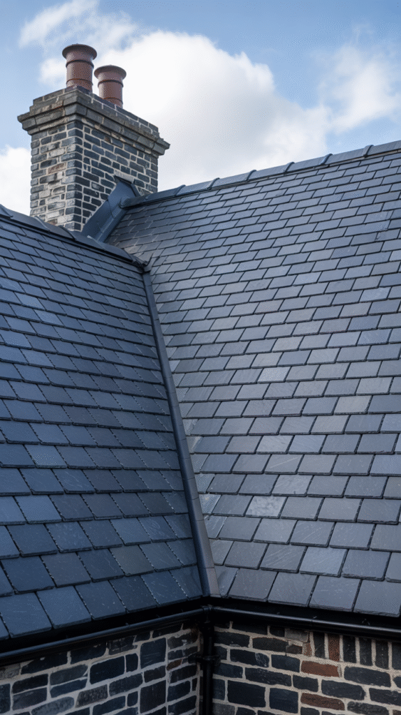A regional variant, Welsh slate roofs use high-quality slate from North Wales, known for its deep blue-black color and fine grain. These roofs have a sleek, elegant appearance, with tiles often cut into precise rectangles for a tailored finish.