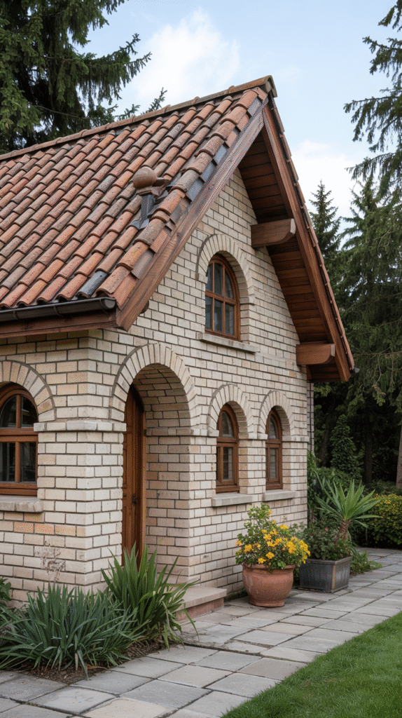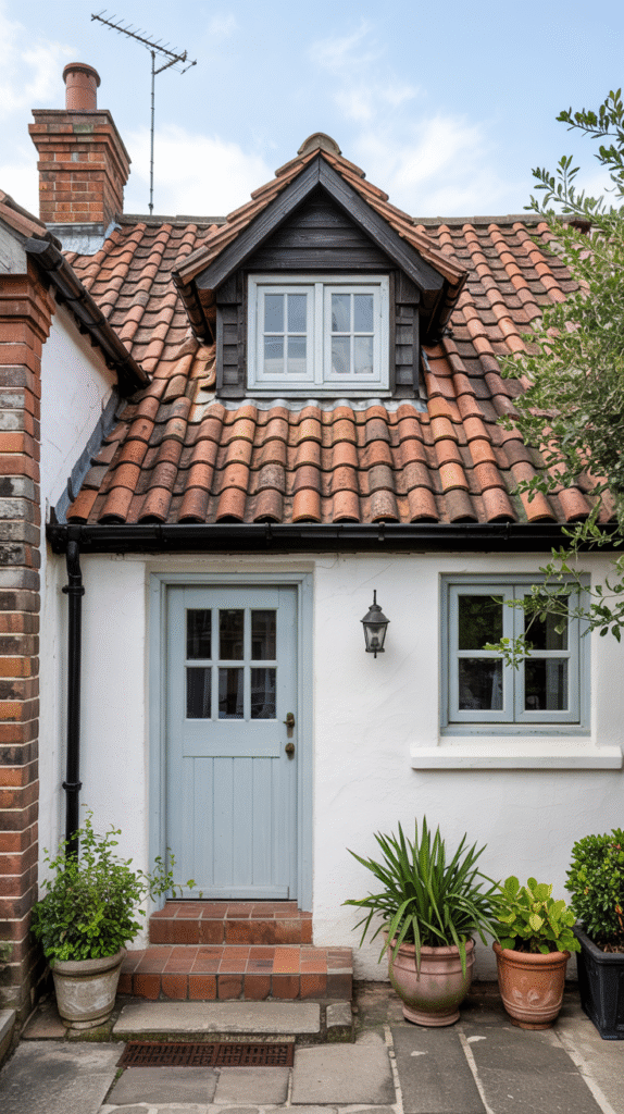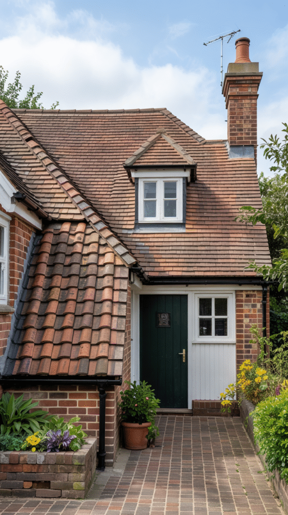 Clay tile roofs, found across southern England, feature curved, reddish-orange tiles that add Mediterranean warmth to the cottage aesthetic. Their interlocking design ensures weather resistance, while the vibrant color complements whitewashed or timber-framed walls.