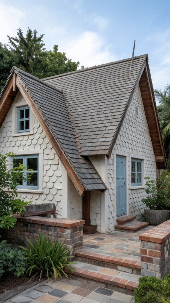 Fishscale tiles, named for their scalloped, fish-like shape, create a decorative, almost whimsical roof pattern. Often made of clay or slate, these tiles are laid in overlapping rows, adding texture and charm to smaller cottages.