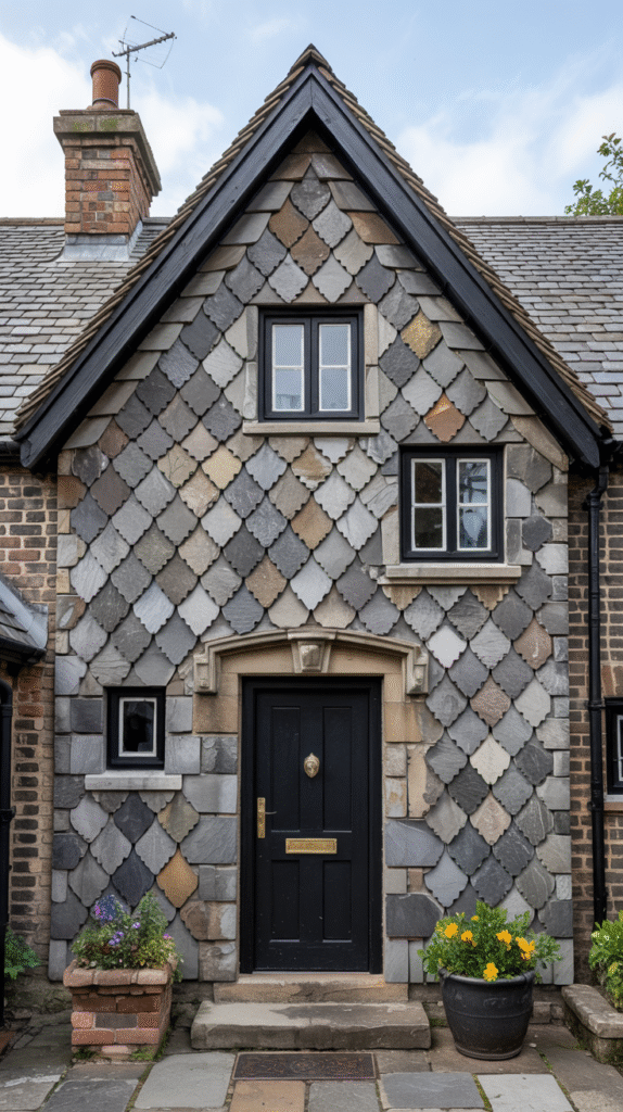 This style features slate tiles cut into diamond shapes, arranged in a geometric pattern. The result is a striking, almost quilted effect, often seen in historic cottages or those aiming for a bespoke, artistic look.