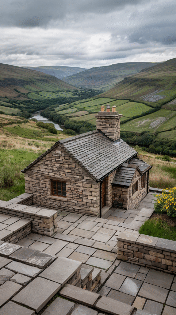 In northern regions like Yorkshire, stone flag roofs use thick, heavy stone slabs for a rugged, fortress-like appearance. Their uneven surfaces and earthy tones blend seamlessly with the harsh, rocky landscapes.