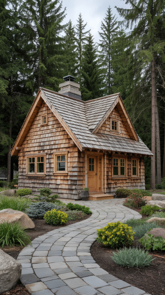 Wooden shingle roofs, though less common, use split timber to create a rustic, handcrafted look. The shingles weather to a soft gray, blending with natural surroundings and adding a tactile, organic quality.