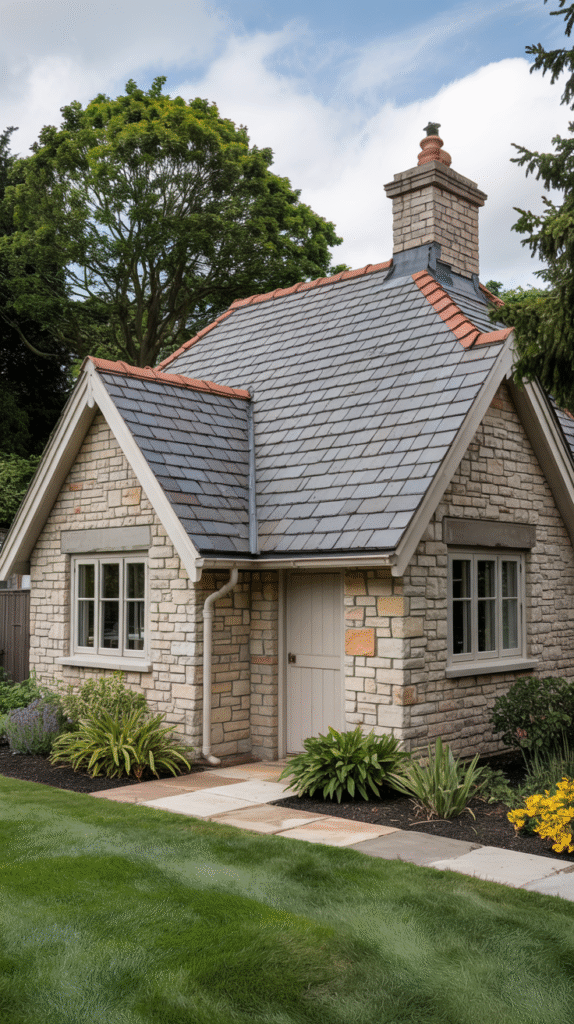 Hipped slate roofs slope on all sides, creating a compact, sturdy structure. The slate’s sleek surface and the roof’s gentle slopes give cottages a polished, timeless look, often seen in larger homes.