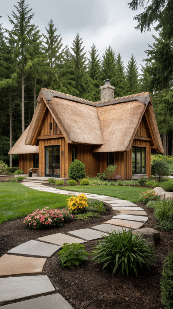 Borrowing from French influences, mansard thatch roofs have a double slope—steep at the bottom and flatter at the top. This maximizes attic space while maintaining the cozy thatch aesthetic.