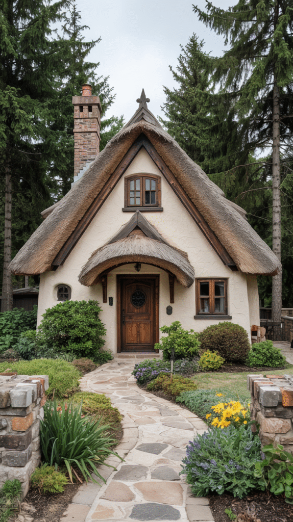 Rare but enchanting, turreted thatch roofs crown small, rounded turrets or dormers. The thatch wraps around these features, creating a fairy-tale-like silhouette that’s perfect for whimsical cottages.
