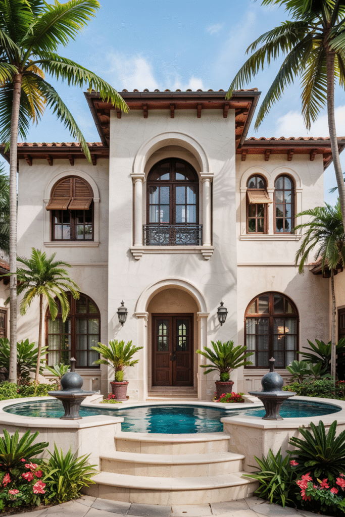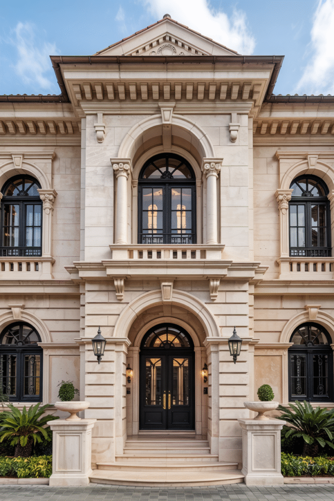 This design combines Mediterranean warmth with neo-classical symmetry. The facade features cream-colored stucco with stone columns and pediments. Arched windows and a red-tiled roof maintain the Mediterranean aesthetic, while a grand entrance with a double staircase adds classical grandeur.