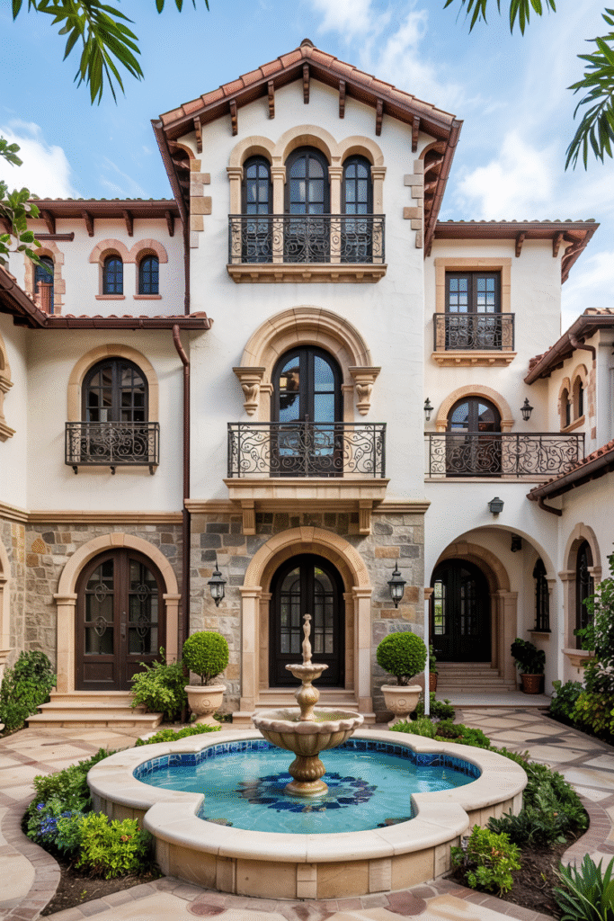 This design blends multiple Mediterranean influences, with a facade of white stucco, stone accents, and colorful tilework. Arched windows, wrought-iron balconies, and a red-tiled roof create a dynamic look. A central courtyard with a mosaic fountain ties the elements together.