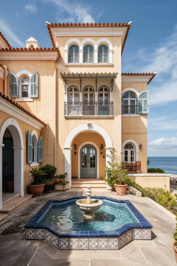 Inspired by Portugal’s Algarve region, this house features pale yellow stucco walls and a red-tiled roof. Arched windows with blue shutters and decorative azulejo tiles add charm. A series of shaded terraces overlook the ocean, and a central courtyard with a tiled fountain creates a serene focal point.