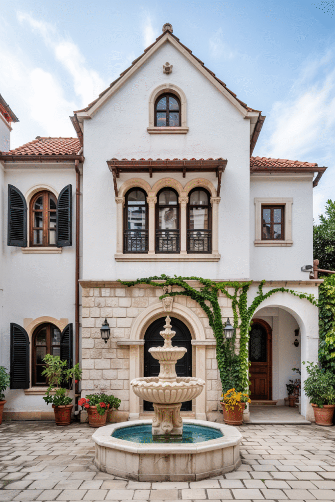 This house combines Greek Revival symmetry with Mediterranean warmth. The facade features white stucco walls and Doric columns at the entrance. Arched windows and a red-tiled roof maintain the Mediterranean aesthetic, while a central courtyard with a stone fountain adds charm.