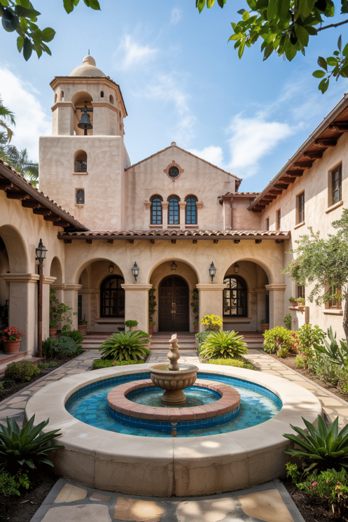 This design channels the romance of colonial Spain with smooth, white stucco walls and a low-pitched, red clay-tiled roof. Arched windows with wrought-iron grilles punctuate the facade, while a grand entrance features a heavy wooden door framed by carved stone columns. Terracotta accents and colorful ceramic tiles line the base of the walls, creating a vibrant contrast. A sprawling courtyard with a central fountain serves as the focal point, surrounded by lush greenery and palm trees.