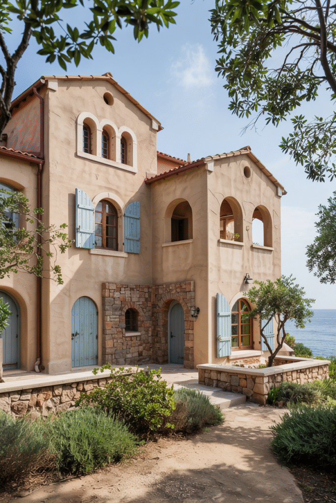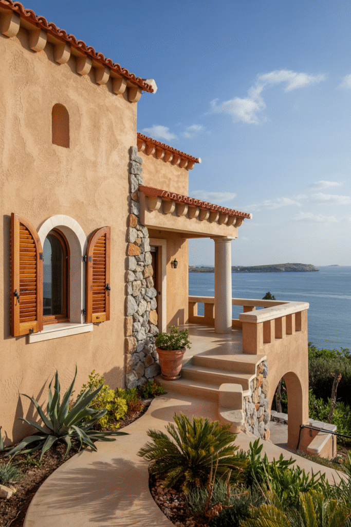 Inspired by Sardinia’s rugged beauty, this house features textured stucco walls in earthy tones and a red-tiled roof. Arched windows with wooden shutters and stone accents create a rustic look. A series of terraces with stone railings overlook the sea, and native plants enhance the natural integration.
