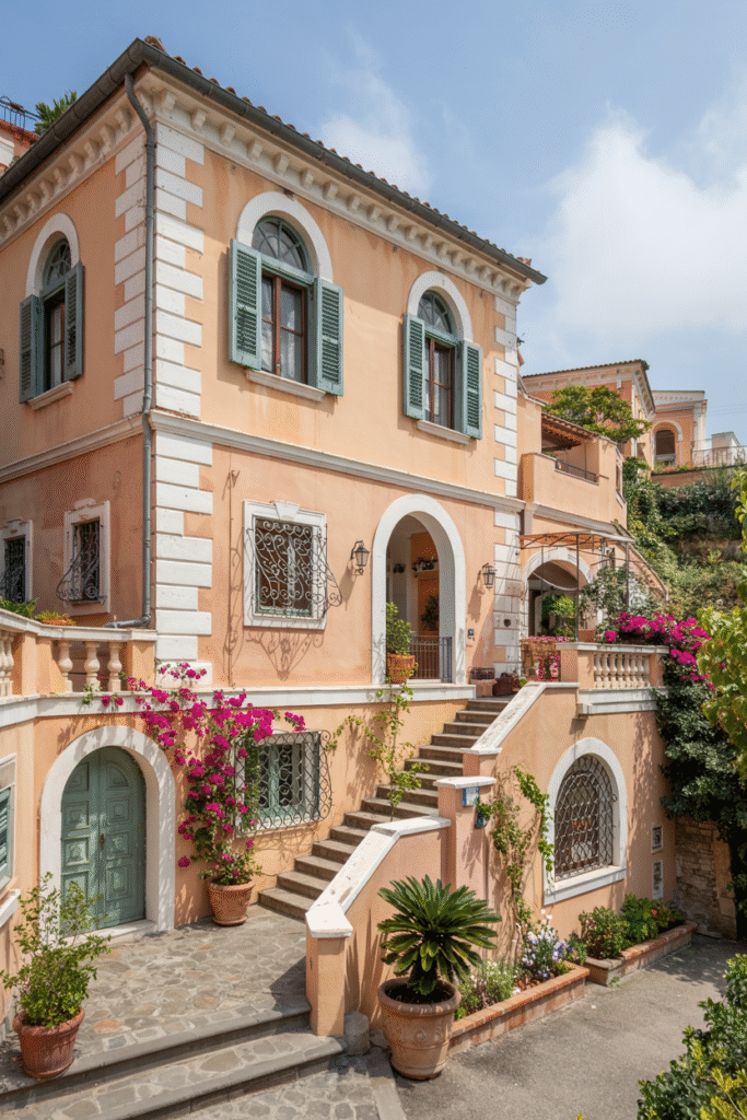 This house captures the charm of Italy’s Amalfi Coast with pastel-colored stucco walls in shades of peach and cream. The facade features arched windows with wrought-iron grilles and a red-tiled roof. Terraces cascade down the hillside, connected by stone staircases, and bougainvillea drapes over the walls.
