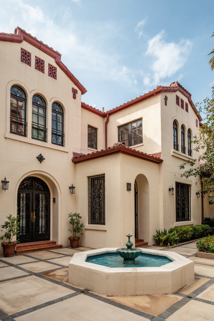This design blends Spanish Revival with Art Deco flair, featuring smooth stucco walls and a red-tiled roof with geometric Art Deco motifs in the tilework. Arched windows with wrought-iron grilles are paired with sleek, streamlined detailing. A central courtyard with a geometric fountain completes the look.