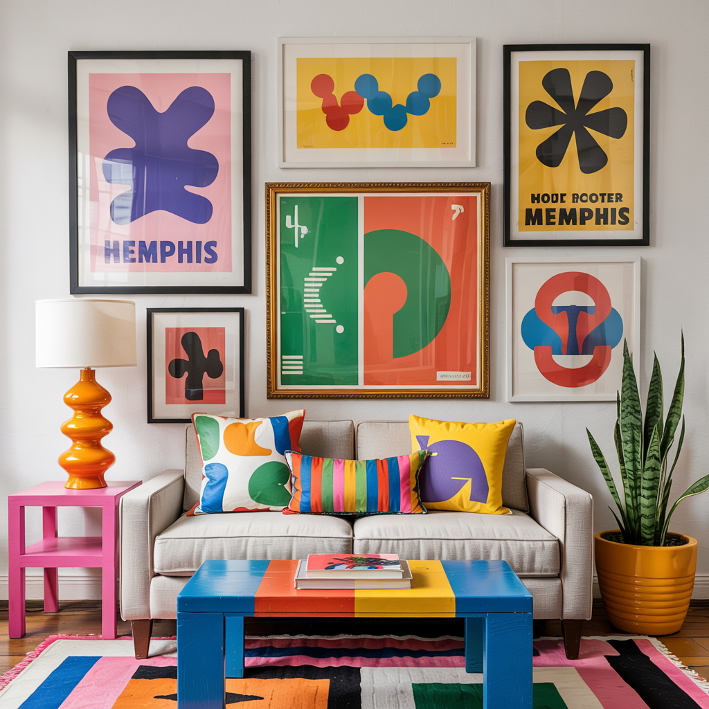 Arrange framed prints of abstract shapes, squiggles, and vintage Memphis posters in mismatched frames. Keep spacing intentionally irregular.