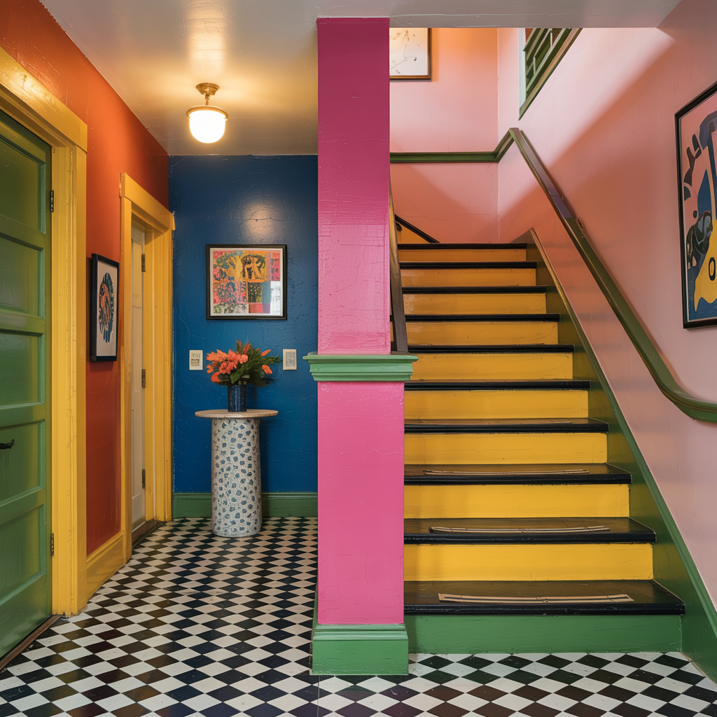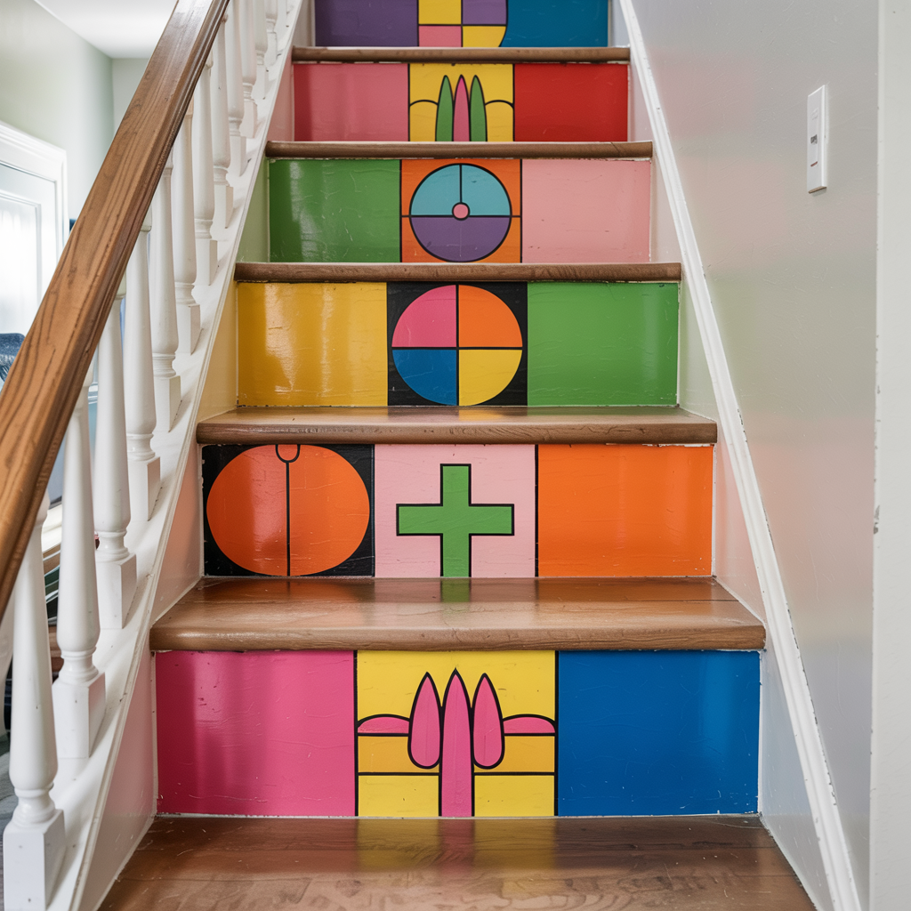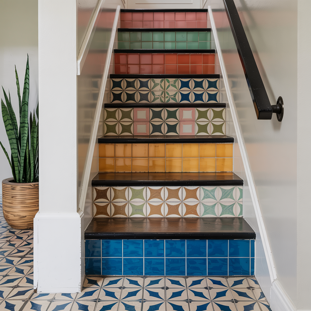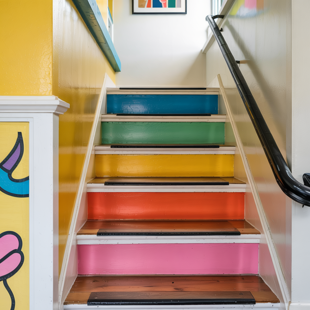 Apply patterned tile or peel-and-stick tile to stair treads for a playful vertical accent. Use anti-slip sealant on top.