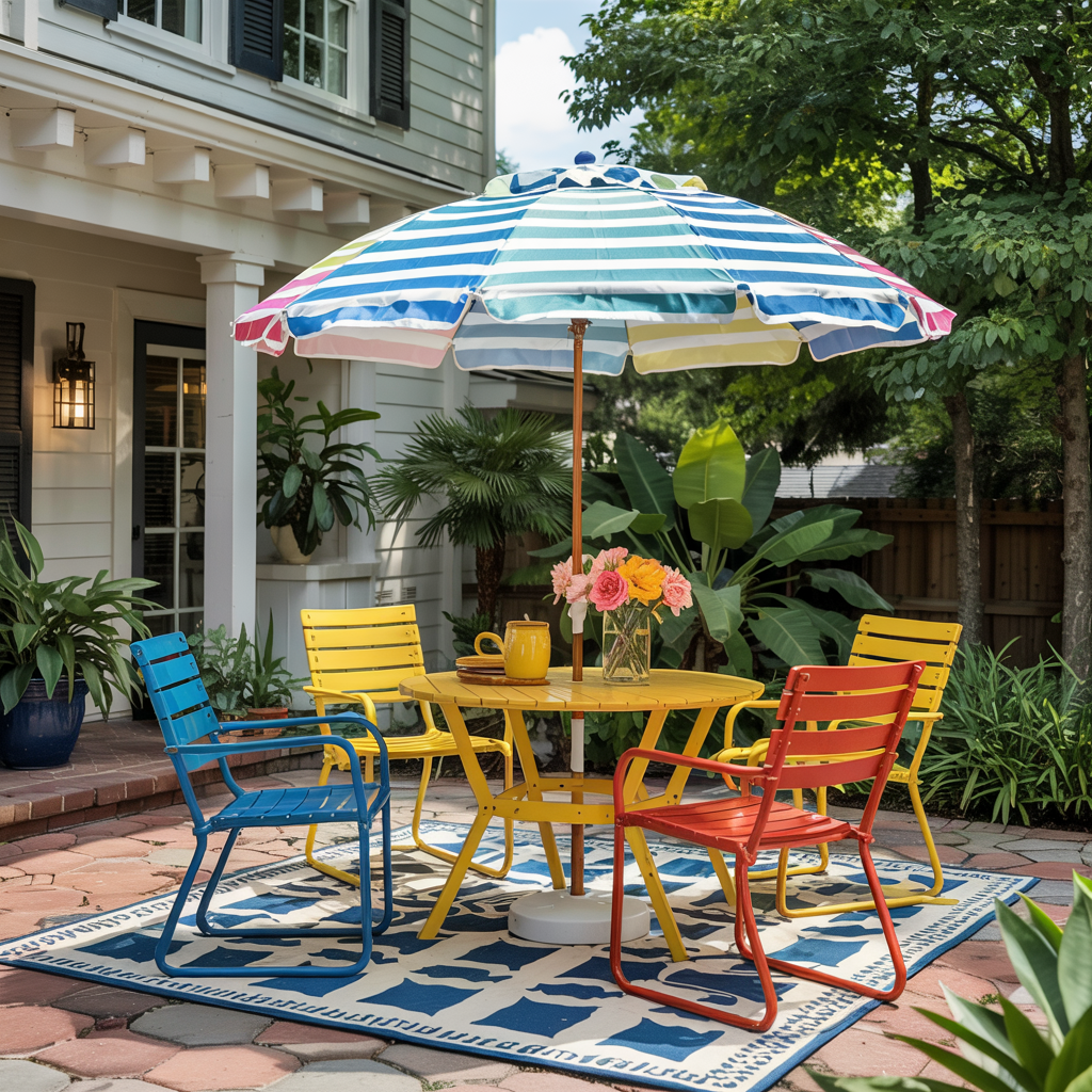 Buy or stripe an umbrella with bold alternating bands; it anchors patios and adds instant Memphis character.