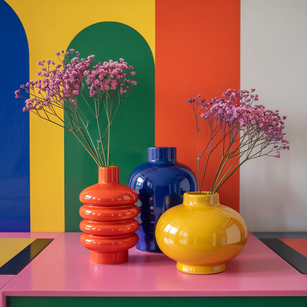 Place oversized ceramic vases in red, blue, and yellow. Use them solo as sculptural objects or with simple dried stems.