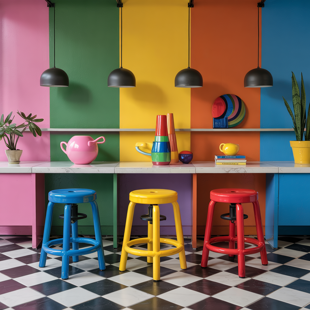 Replace dining or kitchen stools with ones upholstered or painted in primary colors. Metal or molded plastic styles work well.