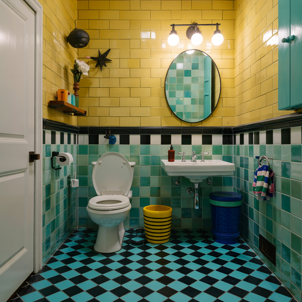 Install small checkerboard tiles in a bathroom floor, using unusual color combos (black + teal). Slope and grout properly to ensure drainage.
