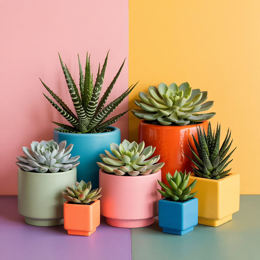 Group planters of different blocky shapes and paint each one in a distinct color. Use succulents for simple care.