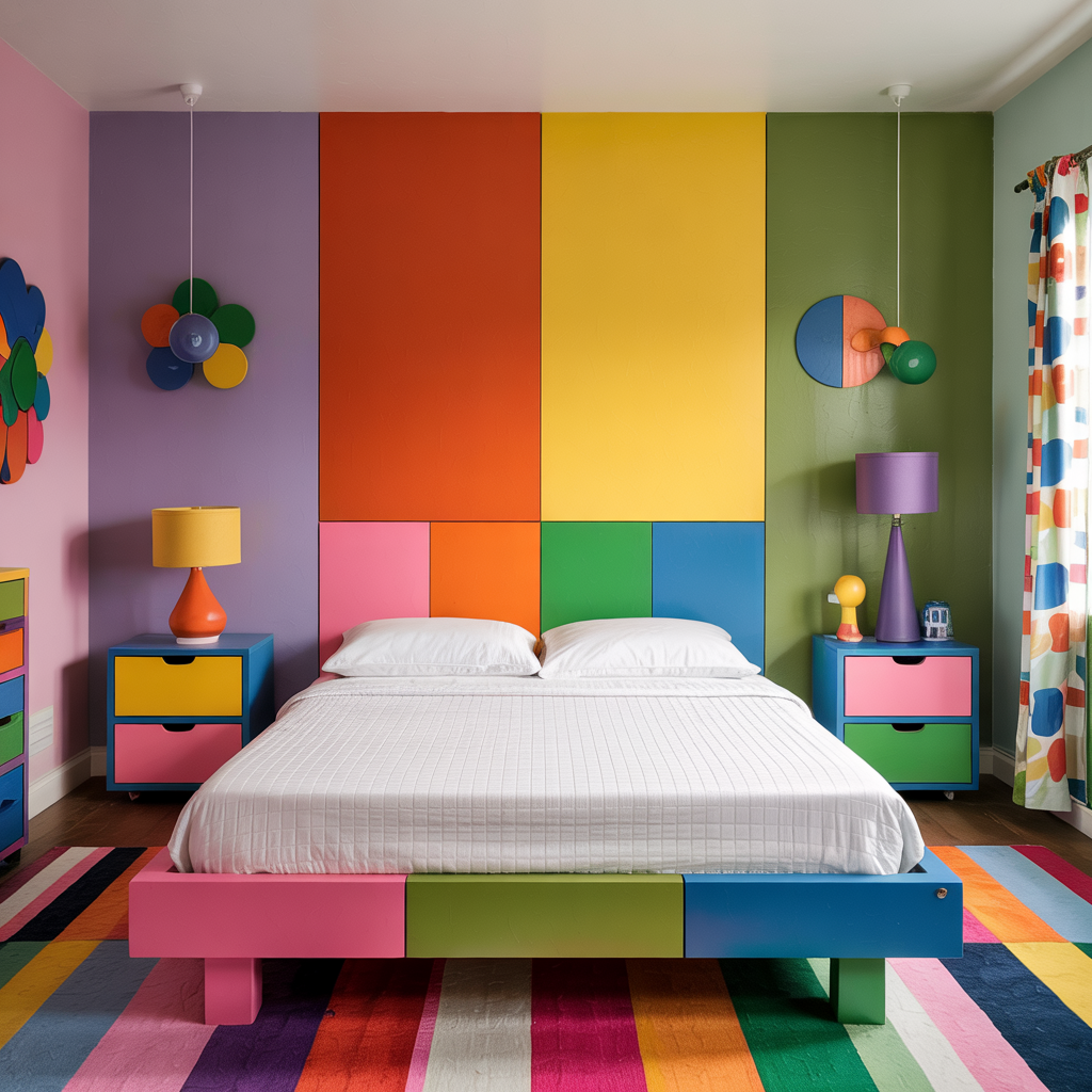 Build or repaint a simple platform bed with a multi-colored headboard made from painted MDF panels. Bolt panels for safety.