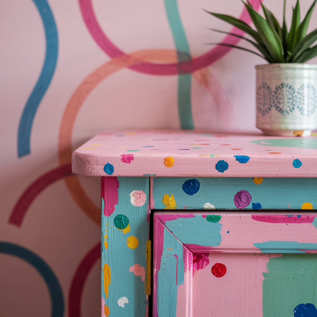 Mix tiny drops of contrasting paint onto a base color to create a confetti speckled look on small furniture pieces or a single wall.