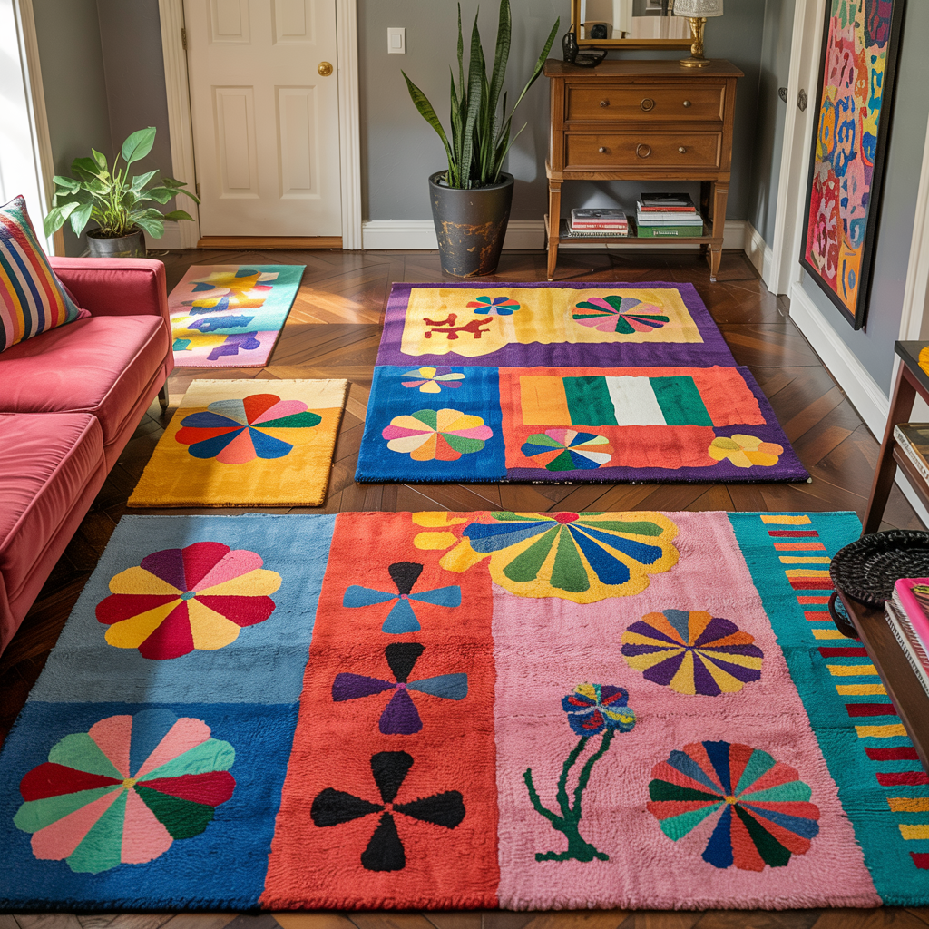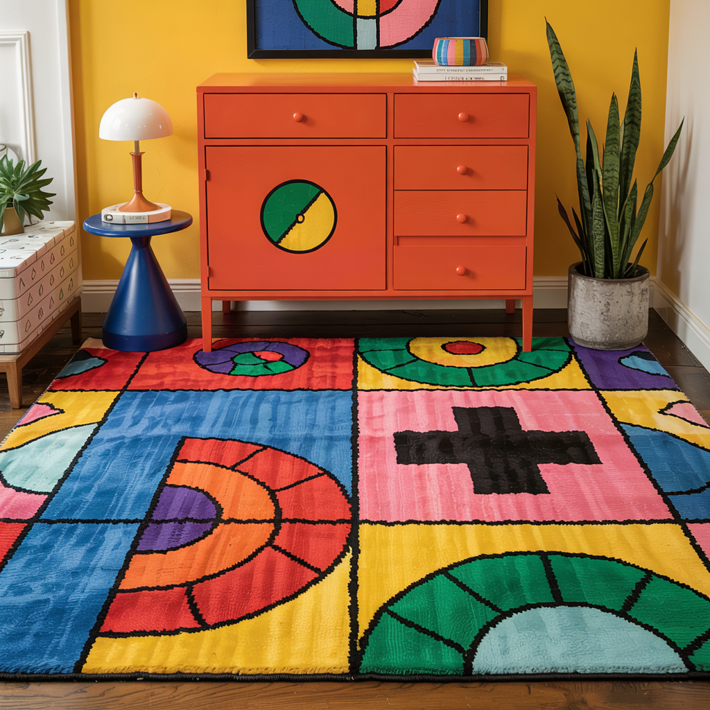 Order a custom rug with Memphis motifs or buy a bold geometric rug. Look for low-pile wool or synthetic blends for easier cleaning.