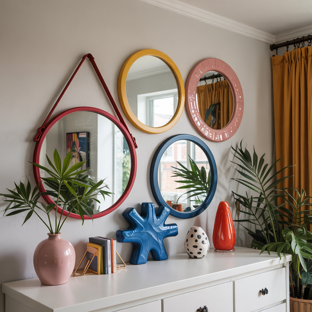 Arrange circular, triangular, and oval mirrors with colored frames in an intentionally messy cluster.