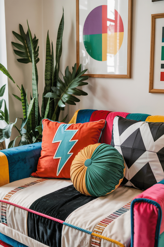 Sew or buy pillows with geometric shapes, lightning bolts, or black-and-white stripes. Mix materials — velvet, cotton, vinyl — for textural contrast.